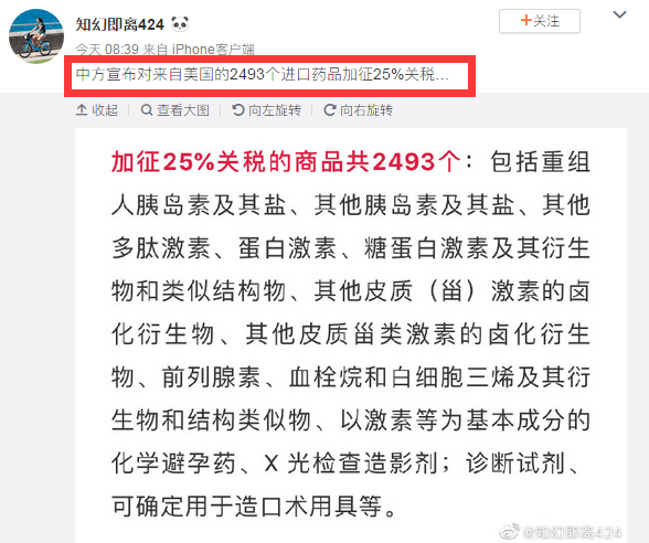 近日,有網傳消息稱,“中方宣布對來自美國的2493個進口藥品加征25%關稅。”捉謠記查證發(fā)現(xiàn),被中方加征25%關稅的商品確實包含2493個,但進口藥品只是所有商品中的一部分。