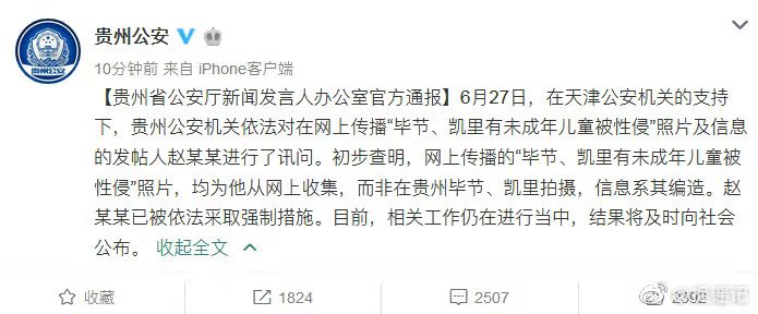 @貴州公安最新發(fā)布消息稱,6月27日,在天津公安機關(guān)的支持下,貴州公安機關(guān)依法對在網(wǎng)上傳播“畢節(jié)、凱里有未成年兒童被性侵”照片及信息的發(fā)帖人趙某某進行了訊問。初步查明,網(wǎng)上傳播的“畢節(jié)、凱里有未成年兒童被性侵”照片,均為他從網(wǎng)上收集,而非在貴州畢節(jié)、凱里拍攝,信息系其編造。趙某某已被依法采取強制措施。