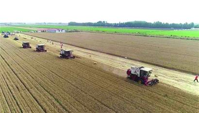 記者在平度市新河鎮庚家村看到,由青島平度金豐公社農業服務有限公司托管的200余畝小麥迎來收割,聯合收割機轟隆隆地在田內穿梭,將金黃的小麥脫粒后裝車?!胞溋o枬M,長勢很不錯。”農戶庚志勇和幾位村民一邊查看小麥長勢一邊介紹說,他家的12畝小麥去年加入了金豐公社,購買了土地全托管服務,除澆水外所有農活都由公司的工作人員來做,他當起了“甩手掌柜”。“前幾天刮起了大風,有些鄰居的麥子被吹倒了,公司幫我種的這些一點事沒有,很堅挺。”庚志勇說,種了大半輩子地的他現在悠哉悠哉當起了“地主”,“把地交給公司種,自己省心省事也省工,光等收糧食就行。”