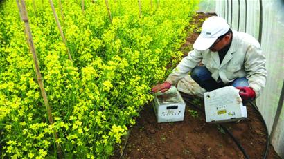蜜蜂研究人員在查看蜜蜂授粉情況。梁超攝