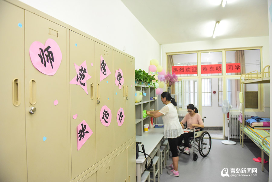 “冰箱、風扇、熱水器、坐便式馬桶……就連進宿舍的臺階都換成了適合推輪椅的坡道。”宿舍顯然經過一番精心布置,五顏六色的氣球、寫滿祝福的便利貼以及進門就能看到的那行大字:“熱烈歡迎蔡東曉同學。”