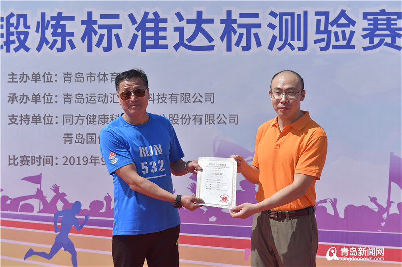 國(guó)家體育總局群體司鍛煉標(biāo)準(zhǔn)處處長(zhǎng)宋云飛(右)為獲得青島市首張國(guó)家體育鍛煉標(biāo)準(zhǔn)達(dá)標(biāo)證書的選手頒發(fā)證書。