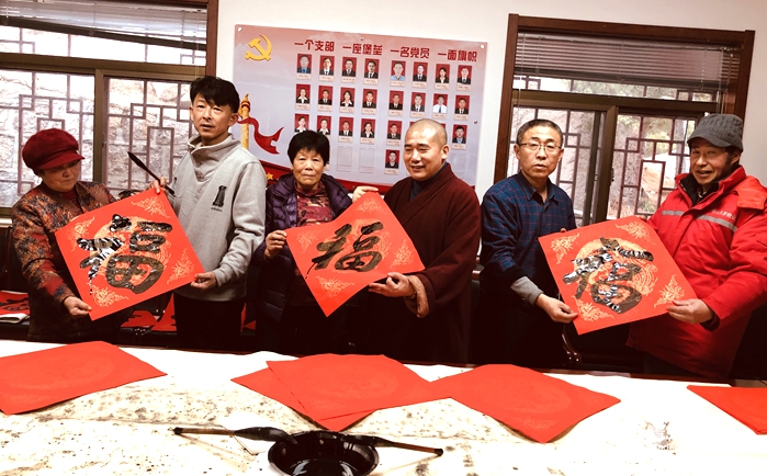 活動當天,華嚴管理處擠滿了前來領“福”的村民。一個個新穎創意的福字,散發著淡雅的墨香。書法老師揮毫潑墨,或行云流水,或龍飛鳳舞,造型各異的“福”字道出了村民對美好生活的向往。