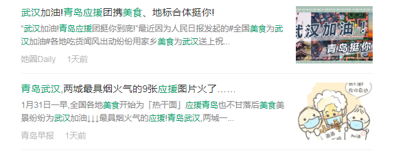 人民日報發起的#全國美食為武漢加油#走紅網絡,各地吃貨聞風出動,紛紛用家鄉美食為武漢送上祝福,青島自媒體人不甘落后,原創推出“武漢加油!青島應援團攜美食、地標合體挺你!”一文,為武漢市民加油打氣。