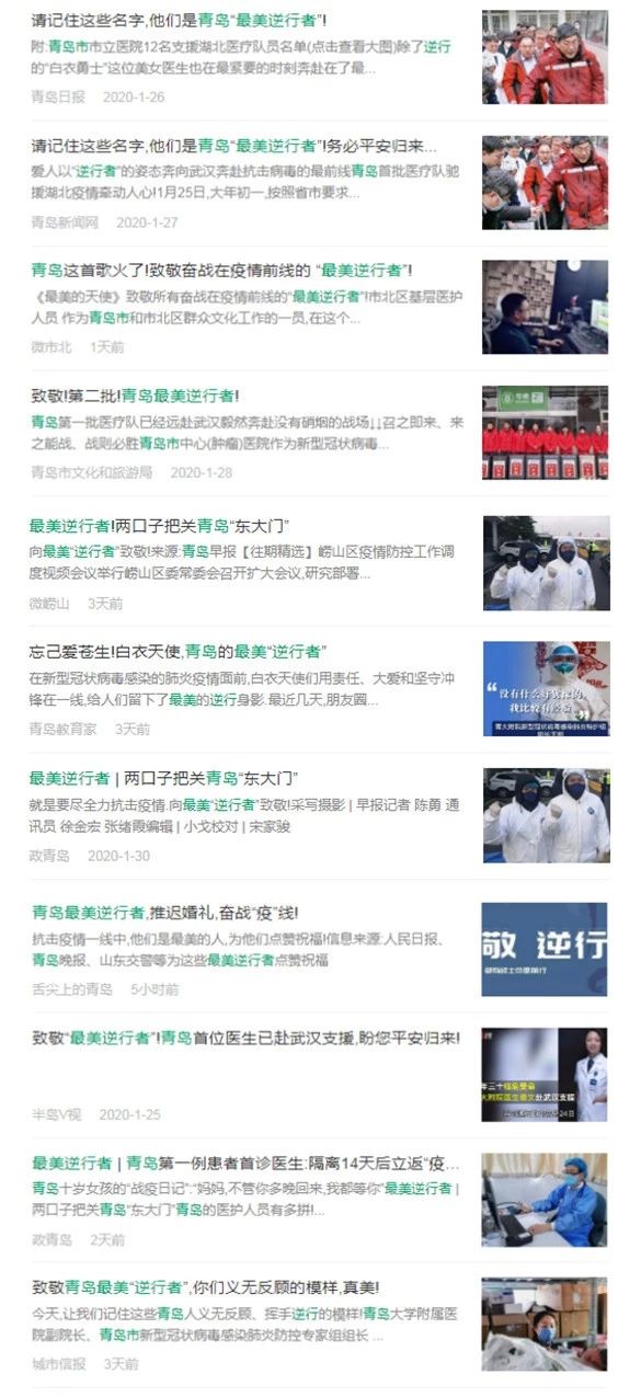 春節假期,當人們都在家中規避疫情,他們卻迅速集結,毅然奔赴沒有硝煙的戰場,為了記錄這些義無反顧、揮手逆行的英雄,青島自媒體紛紛發出“請記住這些名字,他們是青島‘最美逆行者’”、“最美逆行者!兩口子把關青島‘東大門’”、“青島最美逆行者,推遲婚禮,奮戰‘疫’線”等報道。