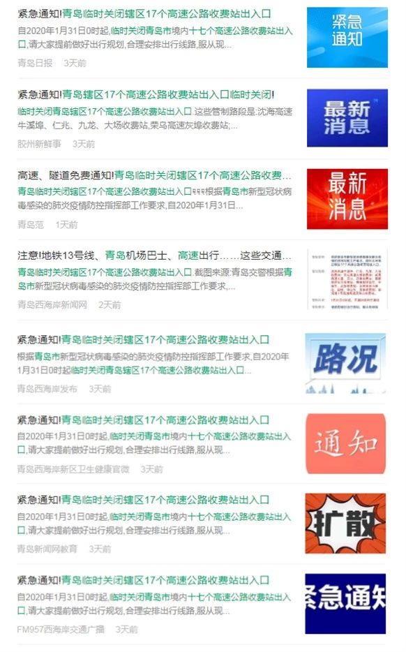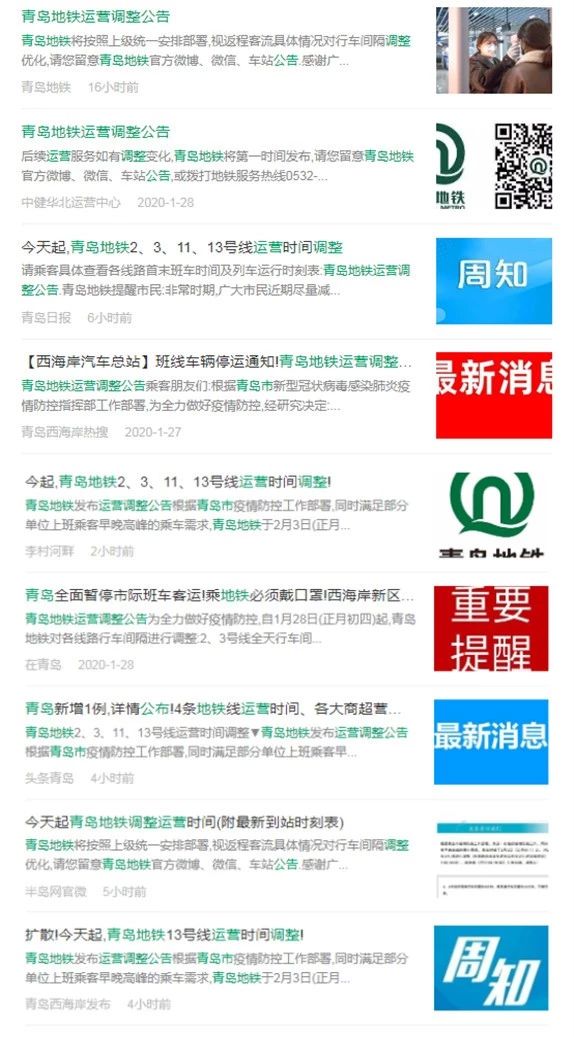 為全力做好疫情防控,青島地鐵、高速分別發布運營調整公告,青島各大官微及時發布最新通知,自媒體積極配合傳播,提前幫助大家做好出行規劃,合理安排出行線路。