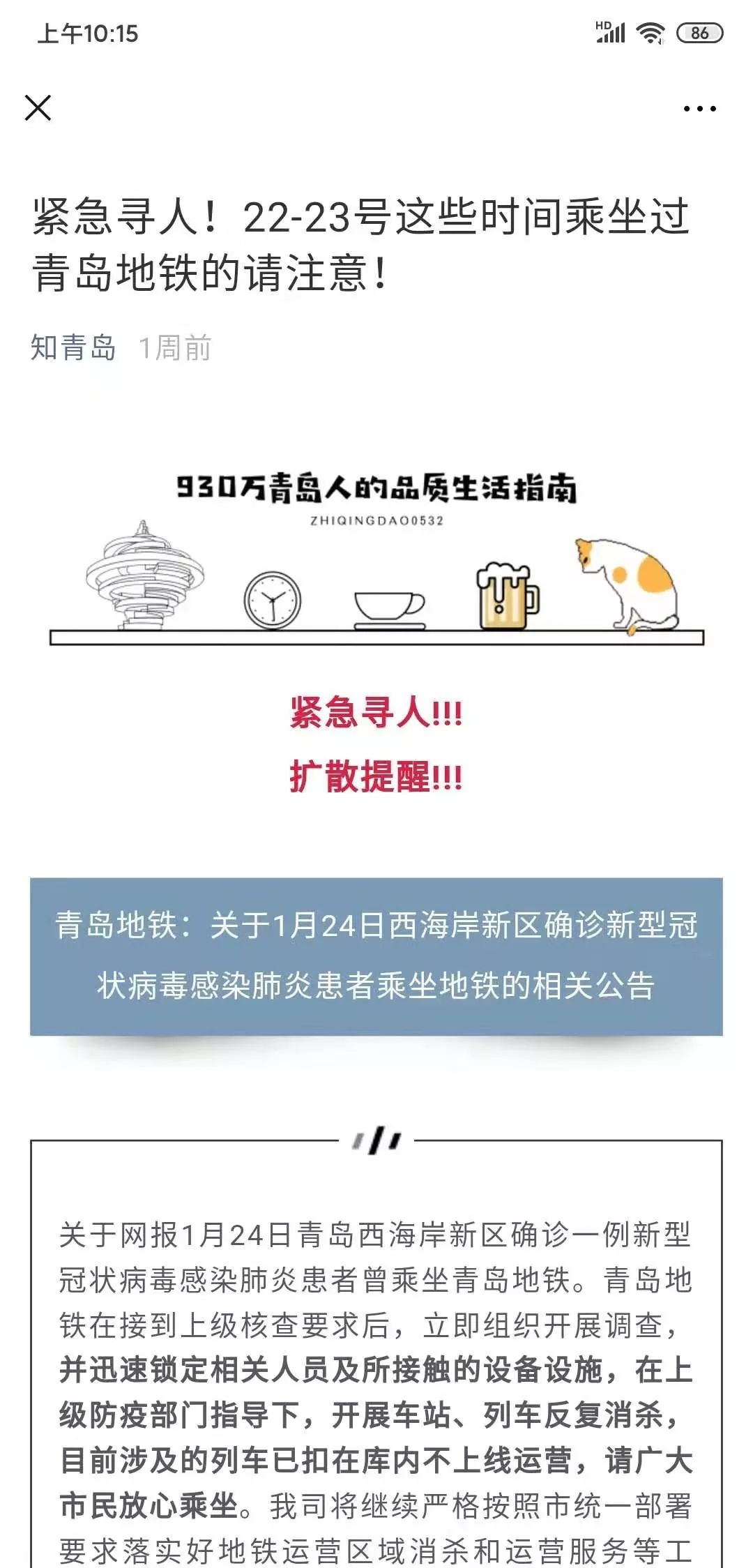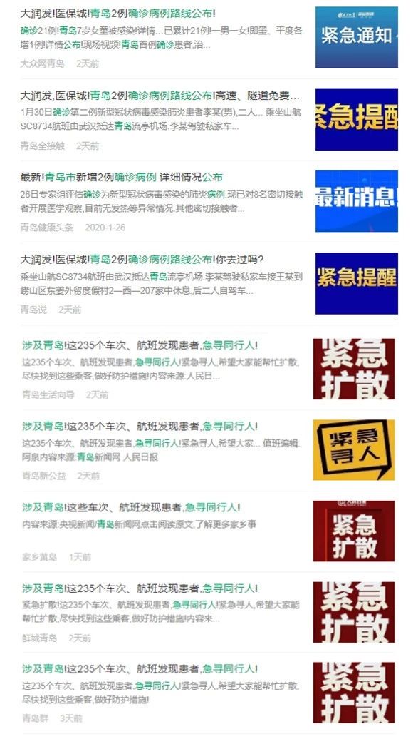 為最大限度防控疫情擴散,除了做好最新疫情信息的通報外,青島各大官微密切關注已確診患者活動軌跡,并及時發出“涉及青島!這235個車次、航班發現患者,急尋同行人!”、“緊急通知!青島這2例患者詳情公布:全程活動軌跡線路請關注!”等報道,引發網友關注。