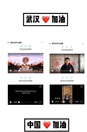 (二)開展抗疫主題活動。青島市慈善益站青島科技大學法學院利用學院微信公眾號,立足法學與社會工作專業,先后推出普法“戰疫”、心理“防疫”、辟謠“抗疫”、案例“觀疫”一系列專題文章,以便讓法學院全體師生多方面了解疫情情況;法學院學生會主席國奧以及研究生會主席李宛昱號召學生會成員與研究生會成員共同錄制了“武漢加油”專題視頻,用真誠的話語傳遞了抗疫的力量;法學院學子們積極發揮自身特長,用書法、海報、手繪、詩歌、短視頻等多種文化作品形式,助力抗疫工作,致敬“最美逆行者”。同學們的抗疫主題作品累計二十余份,體現了同學們共同打贏疫情防控阻擊戰的堅定信心。