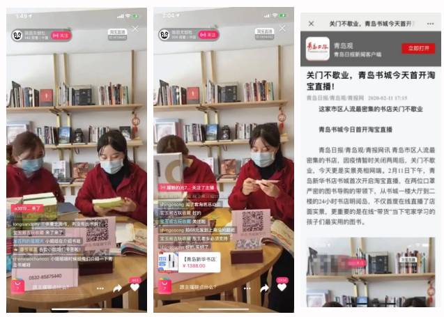 除去值班人員需要嚴(yán)格的消毒與體溫管理外,青島書城下屬4家線上店鋪,分別在天貓(2家)、淘寶和京東。現(xiàn)階段為滿足假期及開學(xué)季前讀者的剛需,上架品種以教材教輔、假期推薦閱讀書目為主,少兒讀物、社科文藝為輔。書城暫停營(yíng)業(yè)期間,廣泛宣傳線上服務(wù)方式。2020年2月5日,青島書城與市南文旅局、愛情島聯(lián)合推出“相信閱讀的力量”書單,進(jìn)一步擴(kuò)大覆蓋面。2020年2月11日,青島書城進(jìn)行首次淘寶直播帶貨,青島日?qǐng)?bào)對(duì)此次直播進(jìn)行報(bào)道,向市民宣傳暫停營(yíng)業(yè)期間可以選擇到書城線上選書。