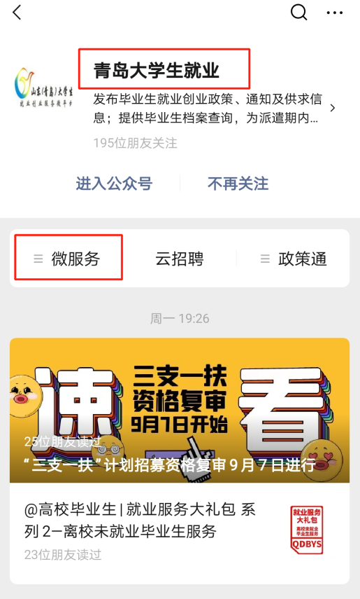2.可關注“青島大學生就業”微信公眾號,在“微服務”選擇“檔案查詢”;