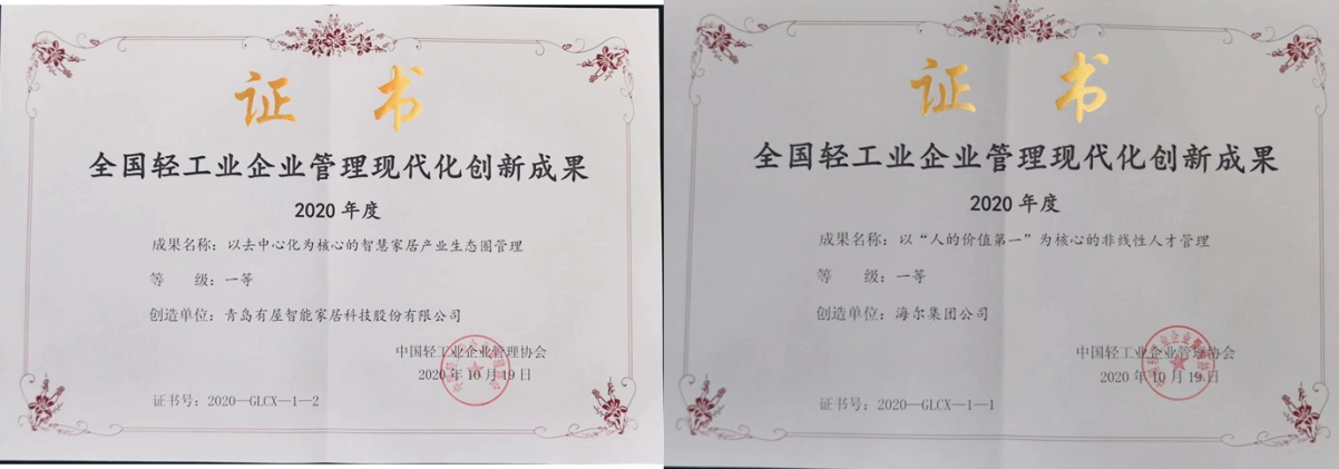 海爾此次獲獎的創新成果分別是《以“人的價值第一”為核心的非線性人才管理》和《以去中心化為核心的智慧家居生態圈管理》。據了解,目前海爾已累計獲得16項全國輕工業企業管理創新成果一等獎。