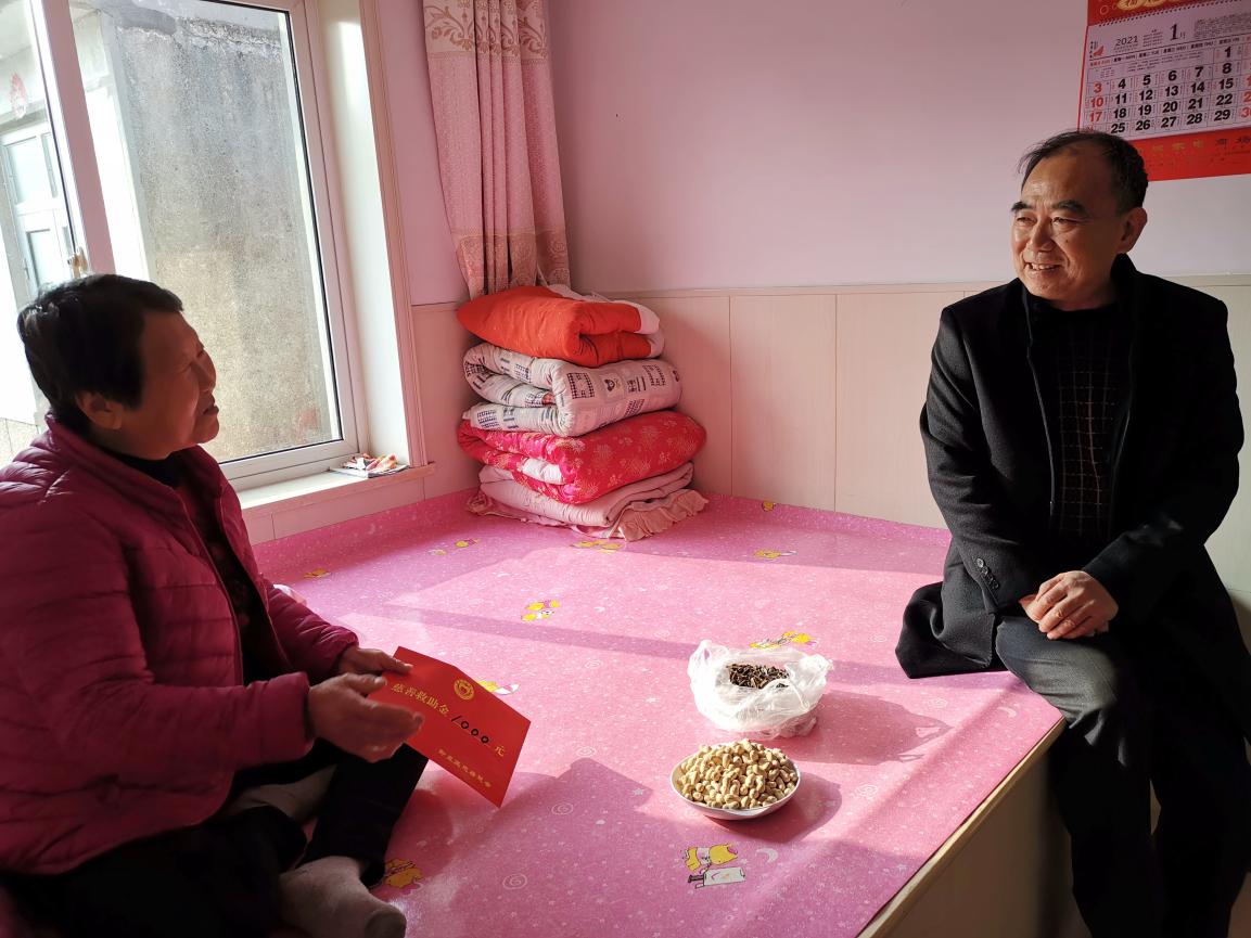 2021年1月25日上午,即墨區慈善總會會長孫鑄一行,來到大信街道走訪慰問。每到一處,孫鑄都問寒問暖,送上新年的祝福。在司家疃一村村民劉美琴的家中,當聽說她在過去的一年中相繼失去了丈夫和三個兒子,如今和殘疾的四兒子相依為命時,孫鑄不禁動容,鼓勵她堅強面對生活,并送上1000元慰問金和價值500元的米、油、被子等生活物資。