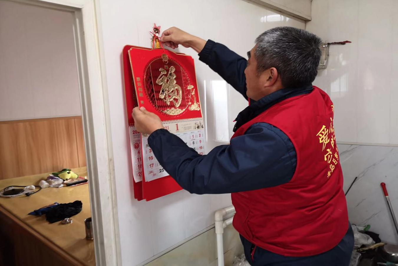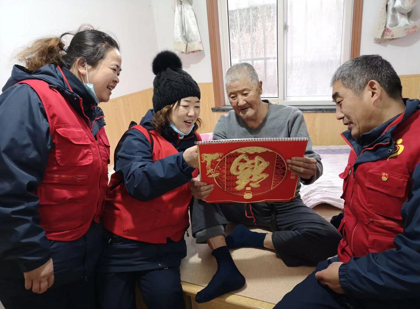 85歲的王淑蘭阿姨家,老人家正在熱炕頭看連續劇,志愿者進屋老人家趕緊拉著志愿者到爐邊取暖,說起前幾日去趕集有送掛歷的老人家就沒要,當別人很詫異時,王阿姨很自豪的說:我有愛心團隊每年都給我送。志愿者們聽了哈哈大笑。志愿者依舊將掛歷掛在了老地方。紅燦燦的“福”字格外喜慶奪人眼目,寓意著新的一年好兆頭。