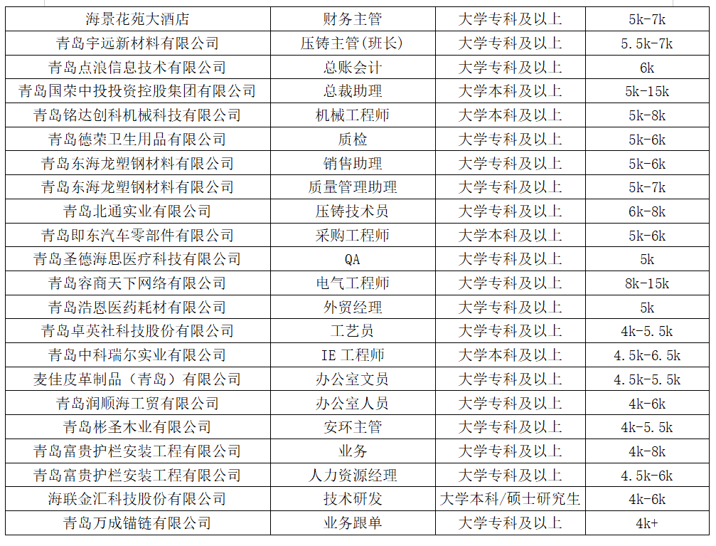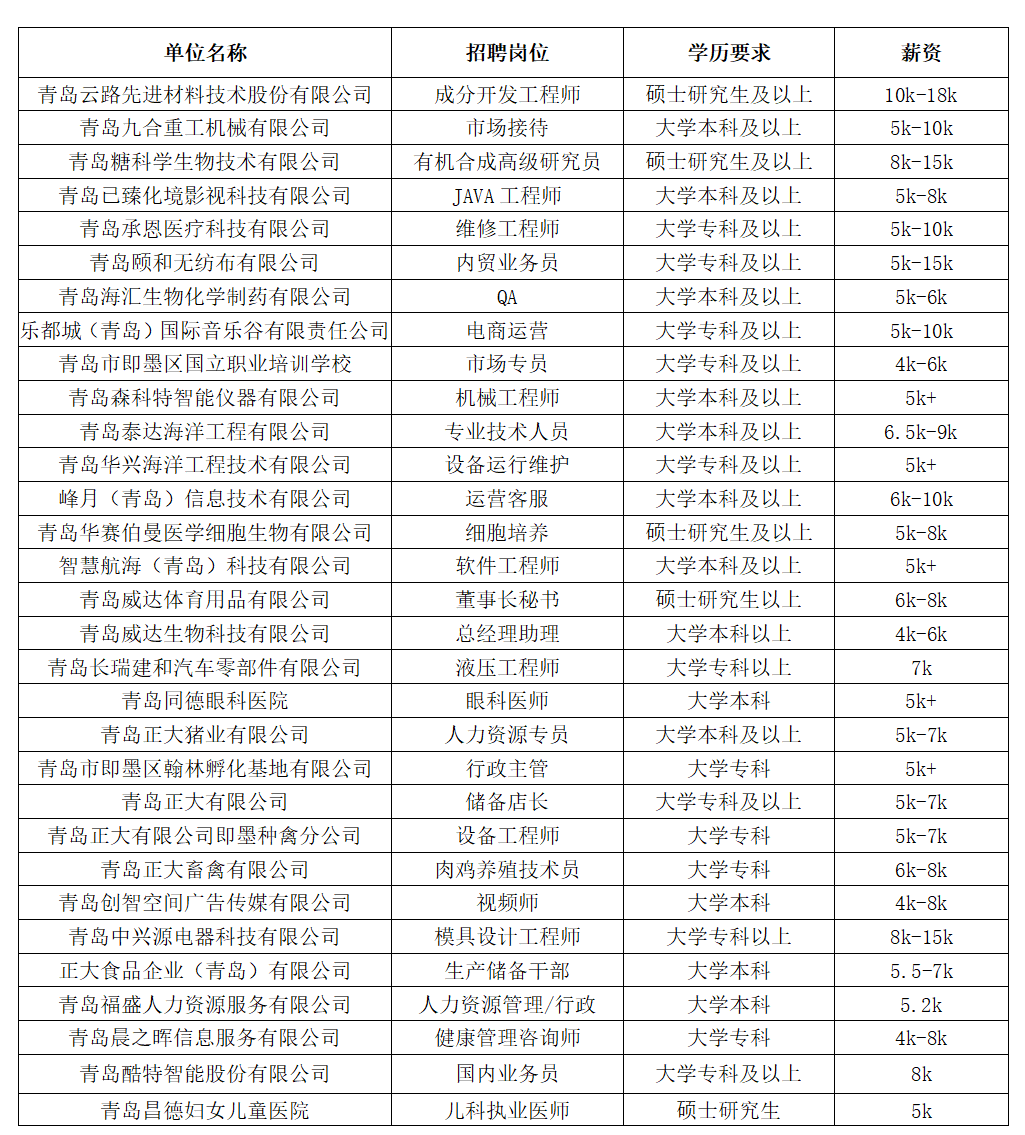 即墨區部分月薪5k+優質招聘崗位