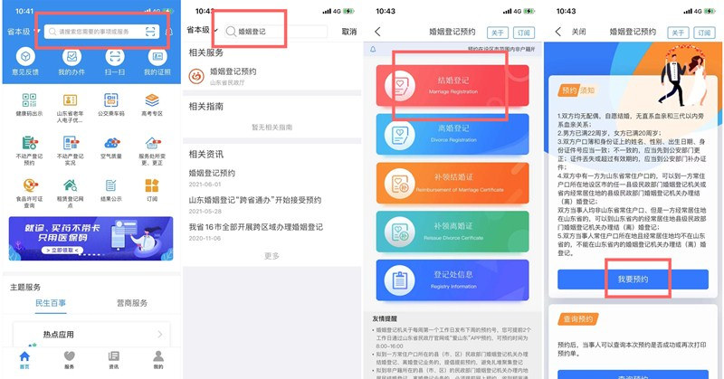 “愛山東”APP上線“婚姻登記預約”服務,只要準新人雙方中有一位是山東戶籍內地居民,便可在“愛山東”APP上選擇省內戶籍所在地縣級民政部門婚姻登記機關,提交結婚登記預約申請,提前拿到“婚姻號碼牌”。