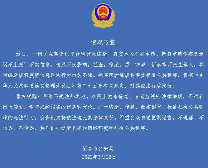 經(jīng)查,徐某,男,26歲,新泰市西張莊鎮(zhèn)人,其對編造虛假疫情信息違法行為供認(rèn)不諱。