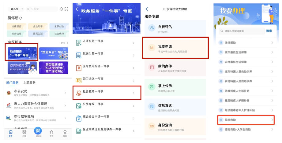 疫情期間倡導不見面審批,因意外事件導致基本生活暫時出現嚴重困難的群眾可通過“愛山東·青e辦”APP中的“政務服務一件事”專區中的“社會救助一件事”在線辦理臨時救助。