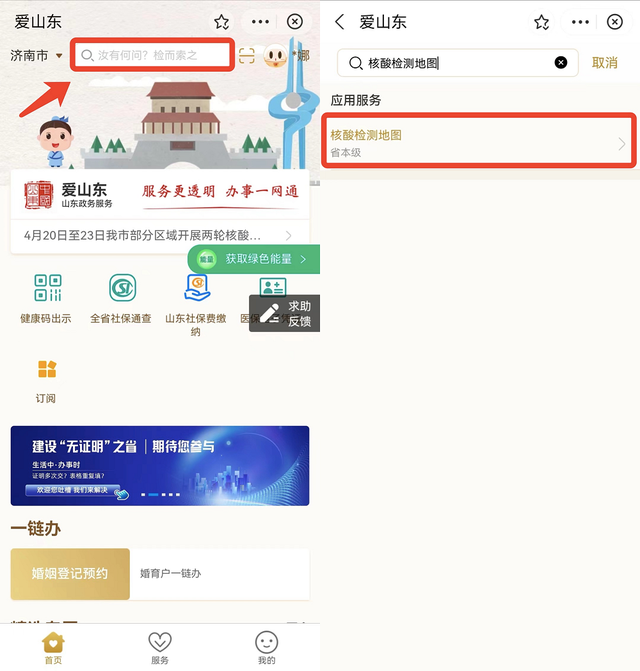 “愛山東”支付寶小程序可在首頁直接搜索進入“核酸檢測地圖”。