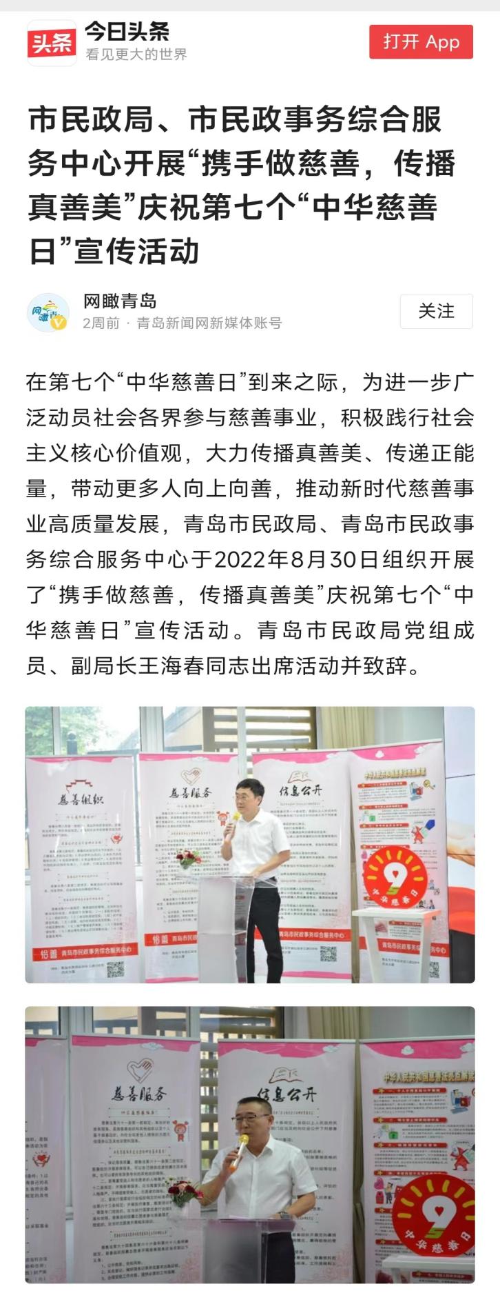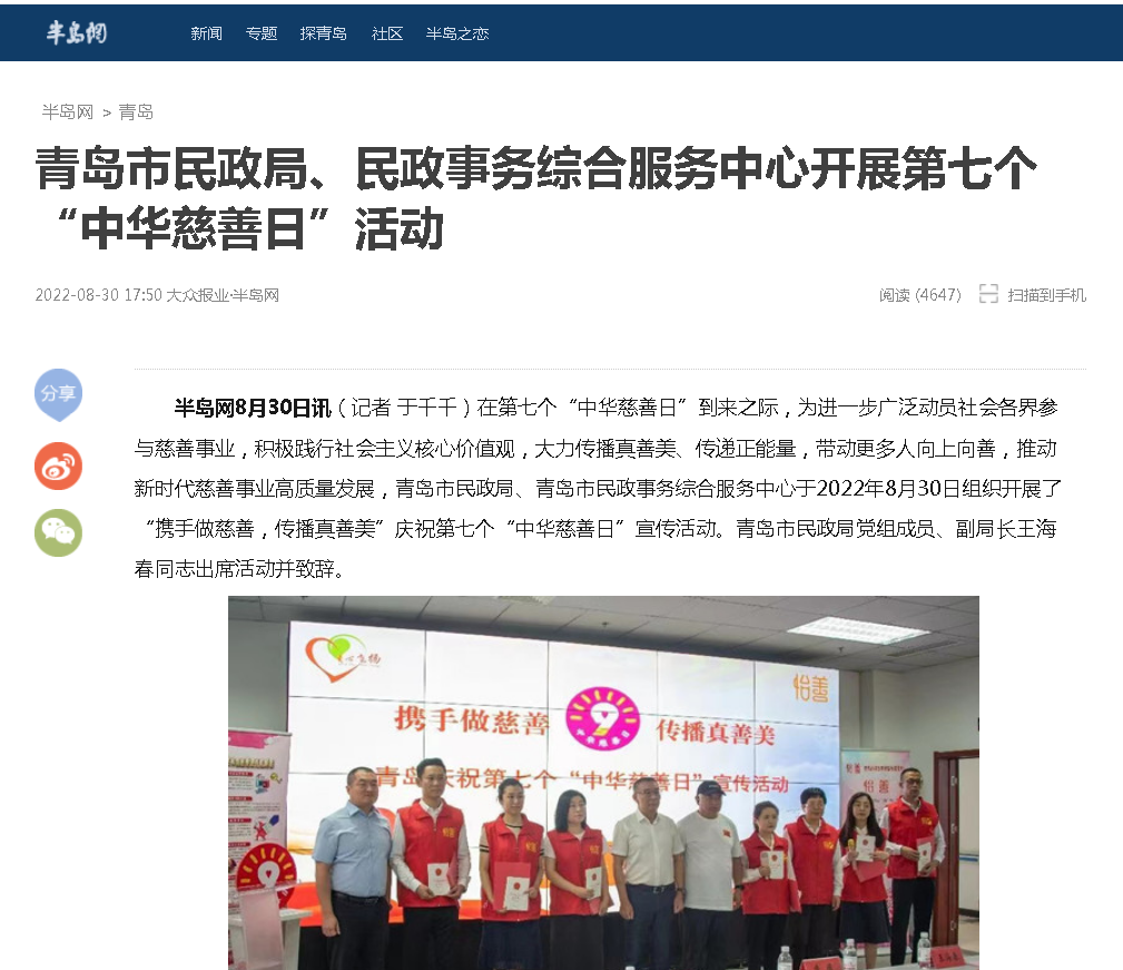 半島網2022-8-30:青島市民政局、民政事務綜合服務中心開展第七個“中華慈善日”活動