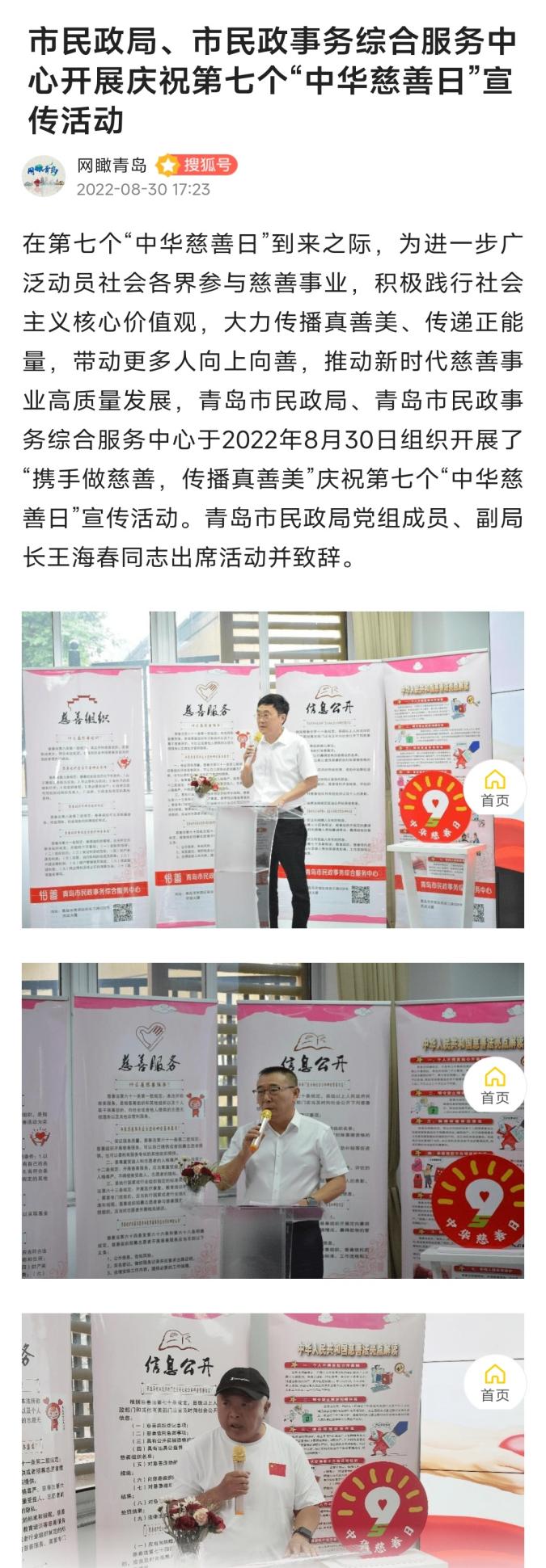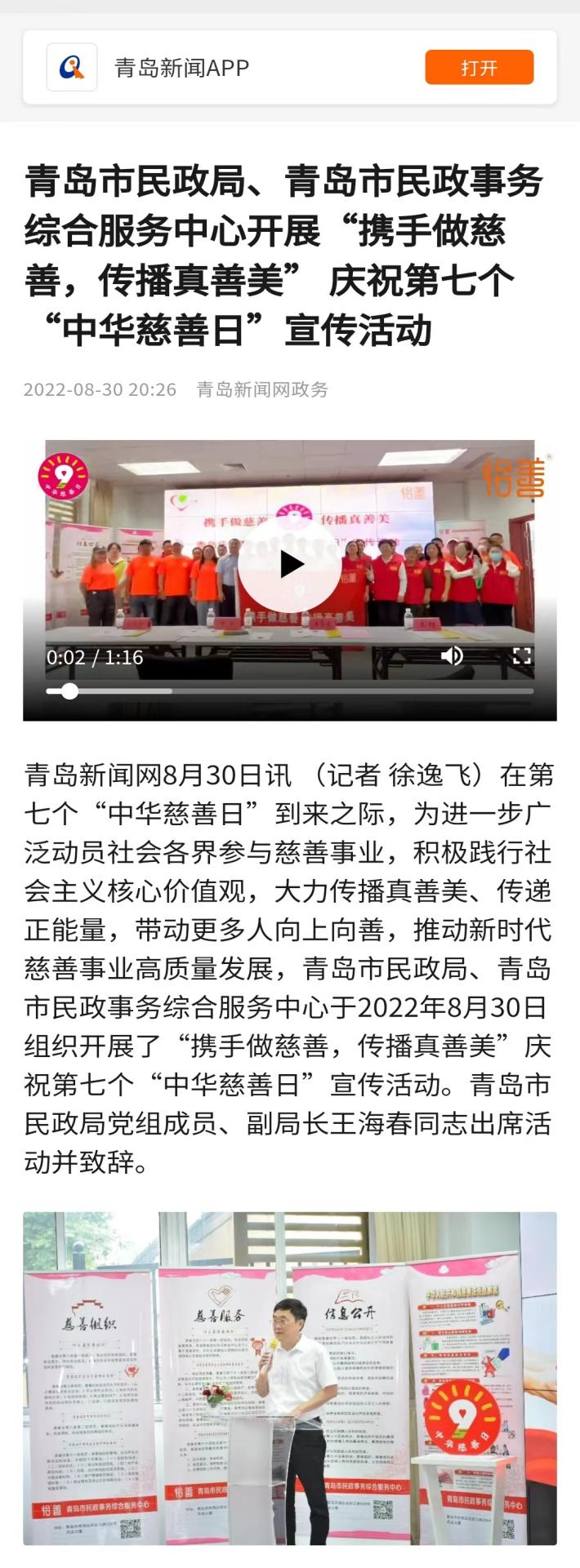 青島新聞網2022-8-30:青島市民政局、青島市民政事務綜合服務中心開展慶祝第七個“中華慈善日”宣傳活動