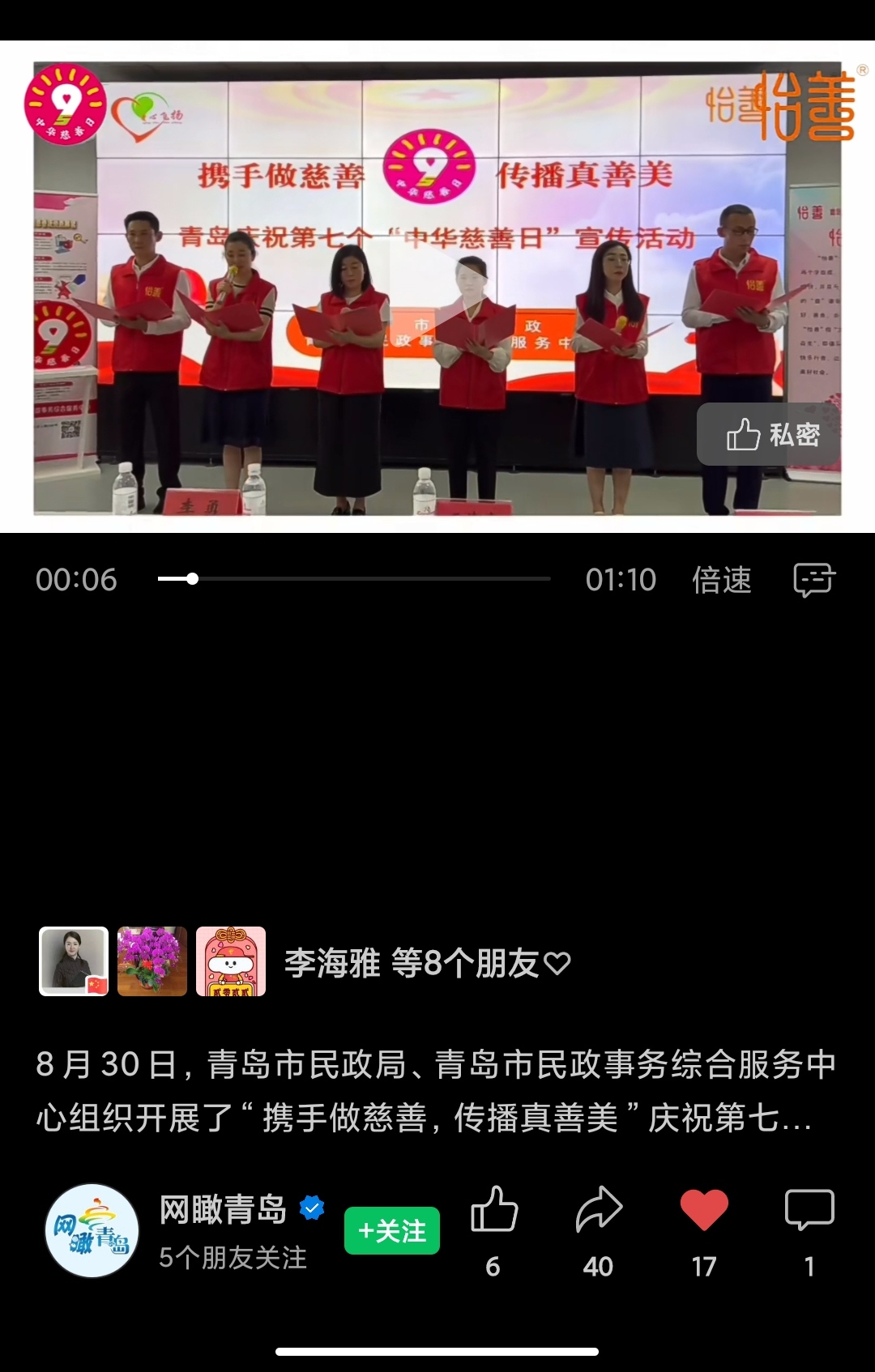 網瞰青島(視頻號)2022-8-30:市民政局、市民政事務綜合服務中心開展慶祝第七個“中華慈善日”宣傳活動