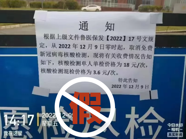 12月9日,有一則網(wǎng)絡流傳的《通知》,宣稱:“根據(jù)上級文件魯醫(yī)保發(fā)〔2022〕17號文規(guī)定,從2022年12月9日零時起,取消免費新冠病毒核酸檢測,現(xiàn)將有關(guān)收費情況告知如下,核酸檢測單人單檢價格為18元/次,核酸檢測混檢價格為3.6元/次”。此信息為虛假信息,山東省醫(yī)療保障局及各市、縣(市、區(qū))醫(yī)保部門均未發(fā)布此類內(nèi)容。