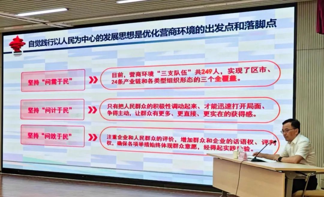 趙發海同志結合學習心得和前期調研情況,重點從三個方面展開詳細的闡述,為全局黨員、干部深入開展學習貫徹習近平新時代中國特色社會主義思想主題教育提供了具體行動指導。一是在學深悟透習近平總書記關于優化營商環境重要論述上下功夫。堅持黨的領導是優化營商環境的根本保證,自覺踐行以人民為中心的發展思想是優化營商環境的出發點和落腳點,處理好政府與市場關系是優化營商環境的關鍵所在,深化改革創新是優化營商環境的源頭活水。二是在認清優化營商環境面臨的新形勢新任務上出實招。要充分認識國內外復雜形勢給優化營商環境帶來的巨大壓力,深入挖掘和激發新時代優化營商環境所蘊藏的無窮潛力,在新征程上立足本職,實現優化營商環境新突破。三是在立足審批服務實踐打造一流營商環境上求實效。要堅持以干成事論英雄、以解決實際問題論能力,以高質量發展項目論業績,把抓工作落實當作全局工作的生命線,錘煉一流作風、鍛造一流隊伍、鑄就一流事業,重點開展好七項行動:黨建品牌擦亮行動、作風能力提升行動、營商環境攻堅行動、政務服務增值行動、數字賦能深化行動、意見建議清零行動、自我革新提高行動。