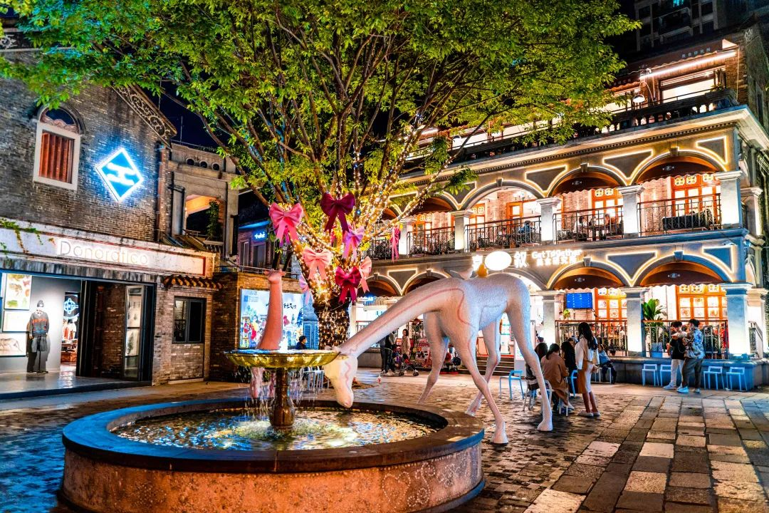 華燈初上,鋪設青石板、水墨磚,擁有鑊耳屋和數不勝收的雕花屋檐的嶺南天地,顯得格外有韻味。各式各樣的品牌店鋪前人頭涌動,盡顯末夏初秋的嶺南煙火氣。