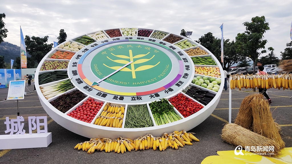 主會場門口,有巨大的“二十四節氣”實物裝置,每個節氣的格子里放著四時蔬果,指針指向“秋分”,吸引眾多市民游客興致盎然打卡留念。