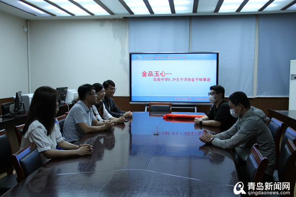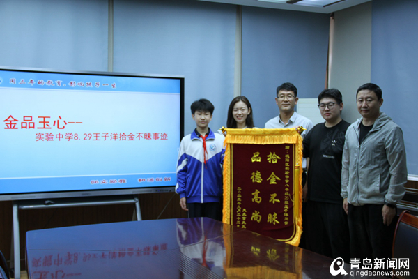 青島新聞網9月26日訊(記者 任俊峰)9月25日,青島市城陽區實驗中學明德樓二樓會議室召開一場特別的表彰會,失主曹先生將繡有“拾金不昧,品德高尚”的錦旗送到城陽區實驗中學八年級二十九班王子洋同學手中,對他拾金不昧的暖心善舉以示感謝。