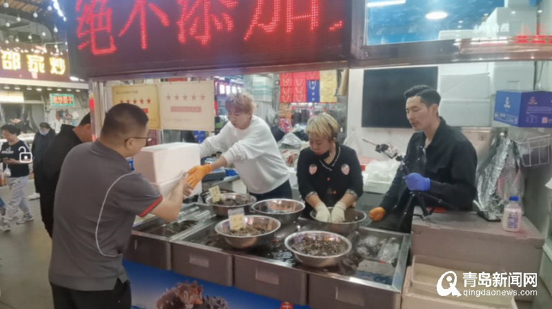 “歡迎大家來到直播間,幾十年青島老店鋪,自家海參加工銷售一體,順豐全國包郵。”團島市場里,剛早上7點,90后的海參老板娘于姍姍已經在攤位前開始了一天的直播。