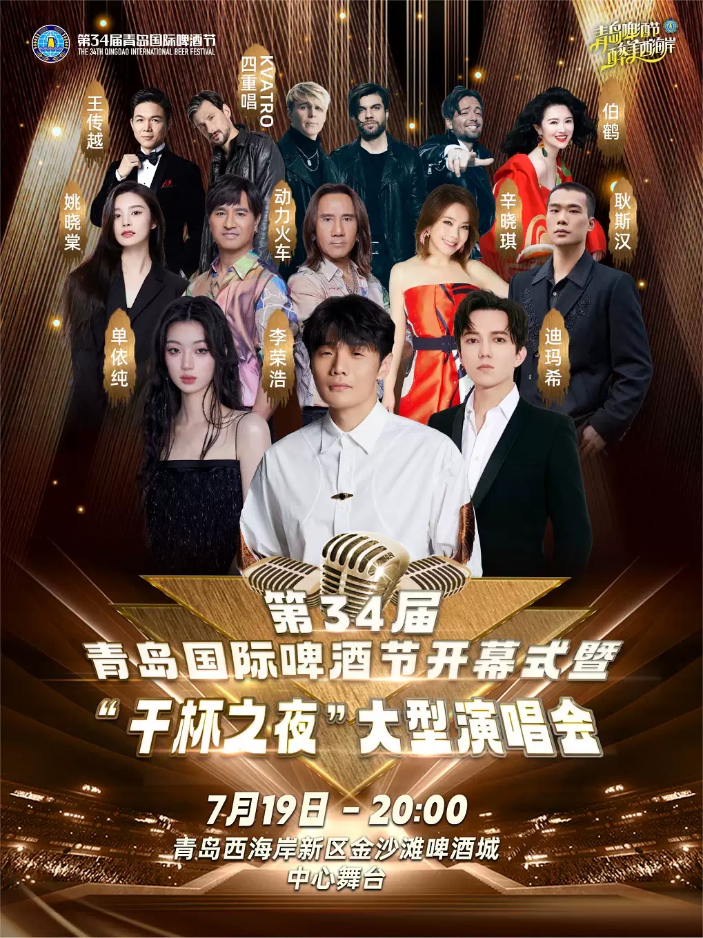 第34屆青島國際啤酒節開幕式暨“干杯之夜”大型演唱會,7月19日周五 20:00,青島西海岸新區金沙灘啤酒城,門票180元-1380元。