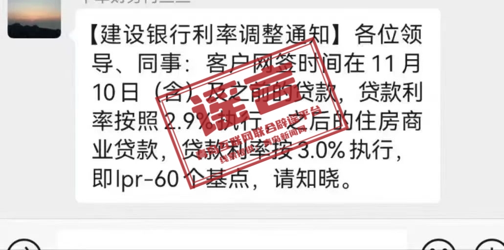 在青島的微信朋友圈、微信群中,一張微信對話截圖流傳,內(nèi)容是“【建設(shè)銀行利率調(diào)整通知】各位領(lǐng)導(dǎo)、同事:客戶網(wǎng)簽時間在11月10日(含)及之前的貸款,貸款利率按照 2.9%執(zhí)行,之后的住房商業(yè)貸款,貸款利率按 3.0%執(zhí)行,即lpr-60個基點,請知曉。”