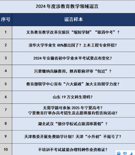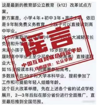涉教育教學領(lǐng)域謠言利用廣大學生和家長對中招高招、學制改革、留學教育、求職招聘等信息的關(guān)切心理,在“招生”“考試”“寒暑假”等時間節(jié)點,散布不實信息,引發(fā)學生和家長不必要的教育焦慮,擾亂正常的招考秩序。
