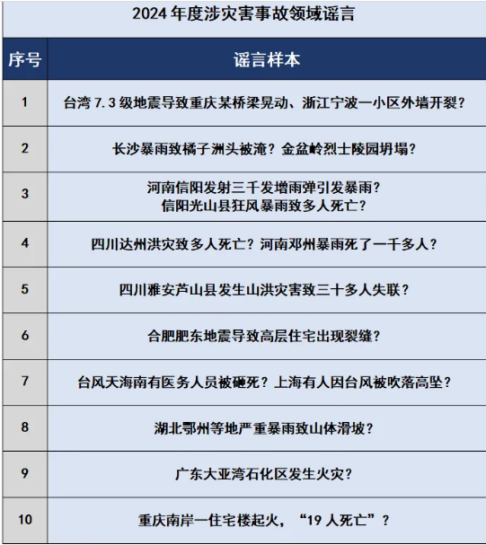 2024年4月初,臺灣花蓮縣海域發(fā)生7.3級地震后,有網(wǎng)民編造“地震導致重慶某橋梁晃動”“浙江寧波一小區(qū)外墻開裂”等謠言混淆視聽,引發(fā)恐慌。2024年汛期,暴雨、臺風接連來襲,全國多地災情嚴峻,個別自媒體和網(wǎng)民為博取關(guān)注、吸引流量,或夸大其詞,或移花接木,或無中生有,借機發(fā)布“河南信陽發(fā)射三千發(fā)增雨彈引發(fā)暴雨”“長沙暴雨致橘子洲頭被淹”“四川達州洪災致多人死亡”“河南鄧州暴雨死了一千多人”“臺風天海南有醫(yī)務(wù)人員被砸死”“上海有人因臺風被吹落高墜”等不實信息,引發(fā)群眾恐慌,造成不良社會影響。此外,謠言“廣東大亞灣石化區(qū)發(fā)生火災”則是利用人們對人身財產(chǎn)安全的重視以及對環(huán)保安防設(shè)施“火炬”(一種高溫燃燒裝置,石油化工企業(yè)用于保障生產(chǎn)穩(wěn)定、減少環(huán)境污染的安防設(shè)施設(shè)備)的不了解,蓄意制造焦慮,擾亂社會秩序。
