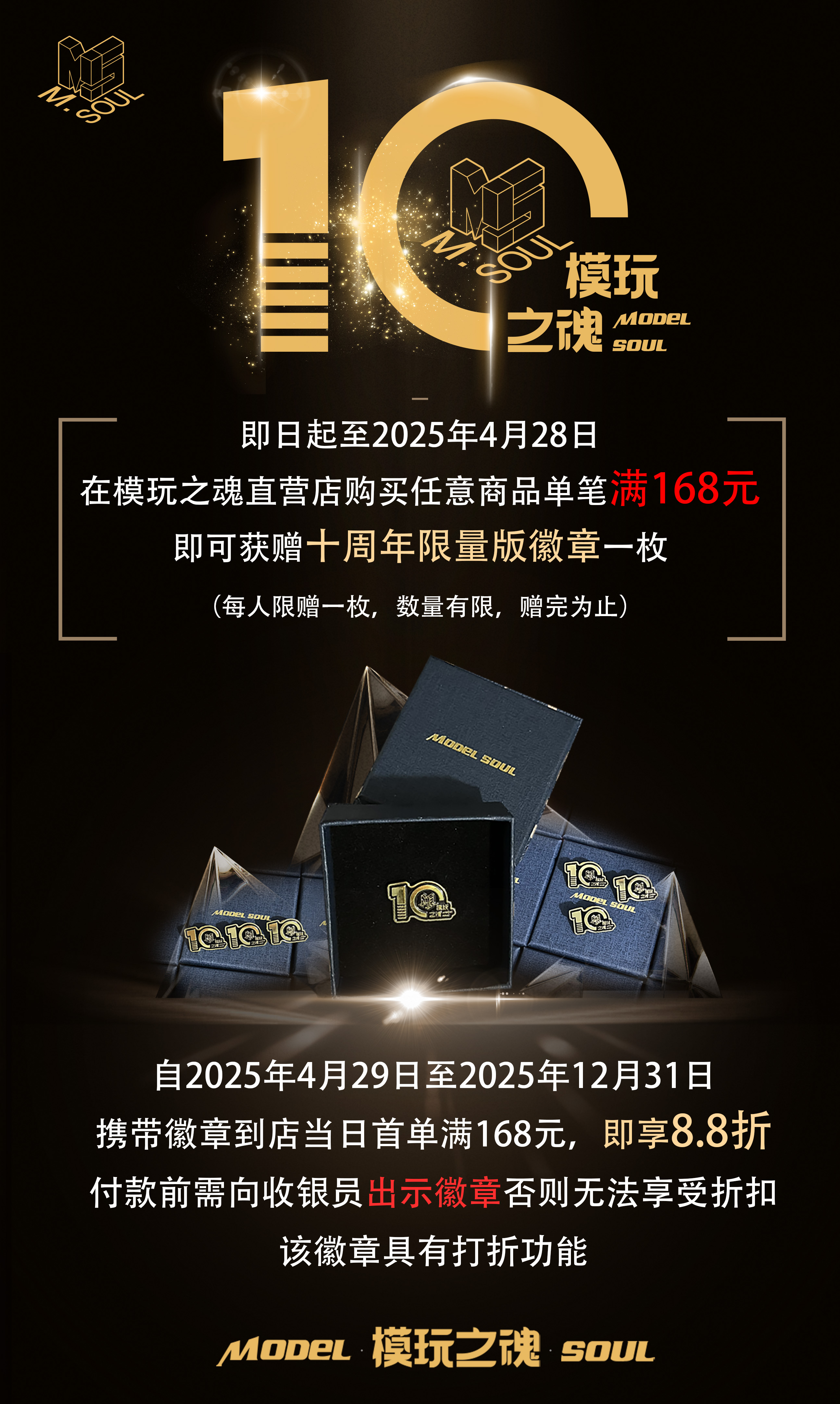 模玩之魂「十周年」之際,即日起至4月28日,在直營店購買任意商品單筆滿168元,即可獲贈十周年限量版徽章一枚(每人限贈一枚,贈完為止),自2025年4月29日至12月31日,攜帶徽章到店當日首單滿168元即享8.8折。